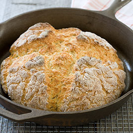 2. Form the dough into a round about 6 to 7 inches in diameter and place in a cast iron skillet. Score a deep cross on top of the loaf and place in the heated oven. Bake until nicely browned and a tested comes out clean when inserted into the center of the loaf, about 40 to 45 minutes. Remove from oven and brush with a tablespoon of melted butter if desired. Cool for at least 30 minutes before slicing. Serve slightly warm or at room temperature.