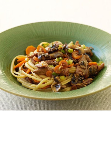 Add drained linguini and carrots, broth, remaining tablespoon of soy sauce and sesame oil to skillet; toss over low heat until combined. Remove from heat and stir in scallions; serve immediately.