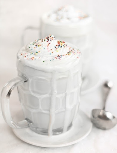 Stir together the whipping cream, milk, vanilla, and white chocolate chips in a slow cooker. Cover and cook on low for 2 to 2 1/2 hours, stirring occasionally, until mixture is hot and chocolate chips are melted. Stir again before serving. Garnish with whipped cream and chocolate syrup if using.