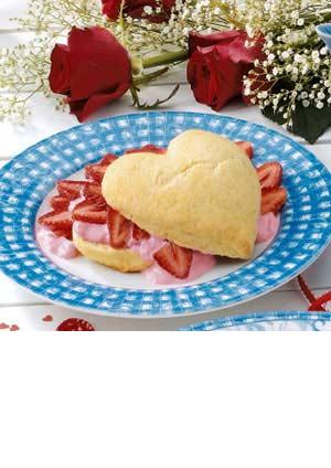 In another bowl, combine the flours, 2 tablespoons sugar, baking powder, baking soda and salt. Cut in butter until mixture resembles coarse crumbs. Stir in buttermilk until a soft dough forms (dough will be sticky). On a floured surface, gently knead dough 10 times. Gently pat or roll into a 1/2-in.-thick circle. Cut out two heart shapes with a 3-1/2-in. cutter.