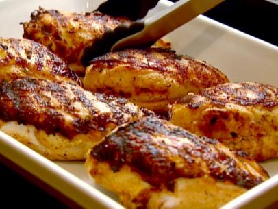 Heat a grill with coals and brush the rack with oil to prevent the chicken from sticking. Remove the chicken breasts from the marinade, sprinkle well with salt and pepper, and grill them skin-side down for about 5 minutes, until nicely browned. Turn the chicken and cook for another 10 minutes, until just cooked through. Remove from the grill to a plate. Cover tightly and allow to rest for 5 minutes. Serve hot or at room temperature.