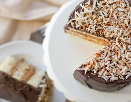 If you like the popular cookies, you will LOVE this Samoa Layer Cake!! Buttery cake layers filled with toasted coconut and caramel and frosted with dark chocolate buttercream — what’s not to love?