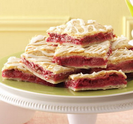 Delicious! I used 3 cups of raspberries and two cups of strawberries, plus the rhubarb called for. I used a sl heaping !/3 cup of cornstarch.. For the crust I used the 3/4 cup milk, then add only Tbs. at a time of milk until it forms a ball. I rolled it on a floured piece of parchment a little bigger than a jelly-roll pan. You can then roll the parchment including the crust and unroll it into the pan . Do the same with the top crust. Everyone loved it!