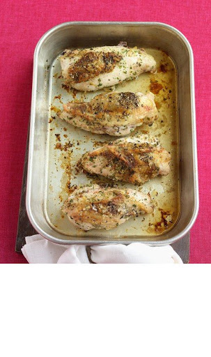 Divide parsley mixture into four mounds. Carefully loosen chicken skin with fingers; tuck parsley mixture under skin. Season chicken with salt and pepper. Place in a 9-by-13-inch roasting pan.