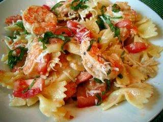In a large serving dish, combine the shrimp and tomato mixture with the farfalle. Toss with some of the basil, reserving a couple tablespoons for garnish. Sprinkle with Parmesan cheese. Serve immediately.