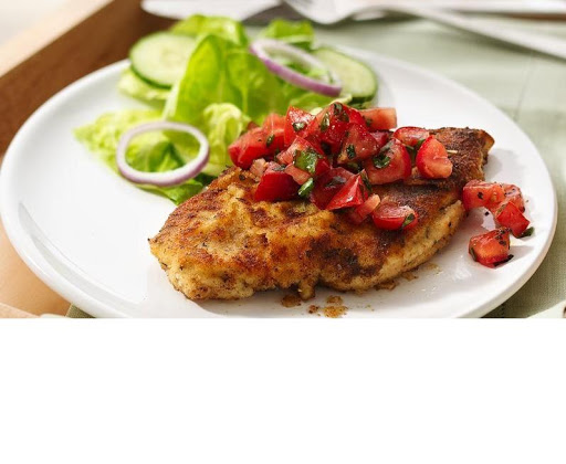 4 In 12-inch nonstick skillet, heat 2 tablespoons oil over medium-high heat. Reduce heat to medium. Add chicken; cook 10 to 15 minutes, turning once, until crumbs are golden brown and chicken is no longer pink in center. Serve tomato topping over chicken.
