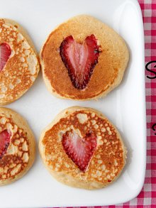 When I want to add a little bit of extra love to my flapjacks, I add a sliced strawberry in the shape of a heart in the middle of each one. It may seem like no big deal, but it tends to have an affect on my family. Luckily no fancy knife skills are required because after you stem a strawberry and then slice it lengthwise, it naturally looks like a heart. Can you think of anything better to serve up for your kids or loved one on Valentine's Day morning than this?