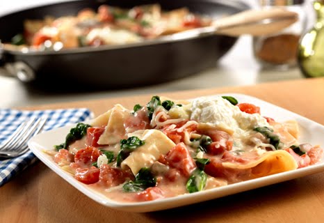 Heat the broth in a 12-inch skillet over medium-high heat to a boil. Break the noodles into pieces and add to the broth. Reduce the heat to low. Cook for 3 minutes or until the noodles are tender. Stir the soup, tomatoes and spinach in the skillet. Cook for 5 minutes or until the mixture is hot and bubbling. Remove the skillet from the heat. Spoon the ricotta cheese on top and sprinkle with the mozzarella cheese.