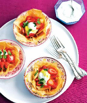 5. To serve, spoon some strawberries with juices into each shell. Top with 1⁄4 cup yogurt; spoon remaining berries and juices over yogurt; drizzle with 2 tsp honey.