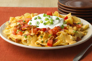 SPREAD chips onto large microwaveable plate; top with cheese. Microwave on HIGH 1 to 2 min. or until cheese is melted.