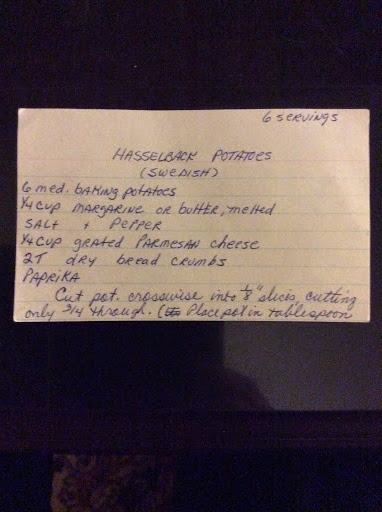 Cut potatoes crosswise into 1/8 inch slices, cutting only 3/4 through. (Place potato in tablespoon while cutting to avoid cutting all the way through.) Place cut side up in greased oblong baking dish, 11 x 7 x 1 1/2 inches. Brush with margarine and sprinkle with salt and pepper.