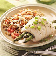 Wrap each fillet around five asparagus spears; secure with toothpicks. Place in a 13x9-inch baking dish coated with cooking spray. Sprinkle with salt and pepper.