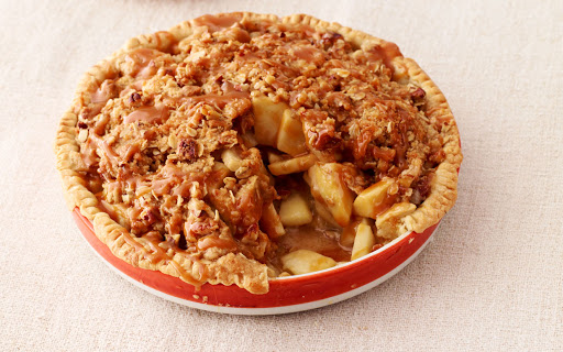 Mound apples into pie pan, then sprinkle on all topping. Cover crust edges with aluminum foil and bake 25 minutes, then remove foil and continue to bake until top is golden brown, 25 to 30 minutes. If top browns too quickly, cover pie with foil. Drizzle caramel sauce over top before serving.