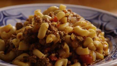 Stir in the macaroni, cover, and simmer over low heat until the pasta is tender, about 25 minutes, stirring occasionally. Remove from heat, discard bay leaves, and serve.