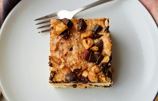 Preheat oven to 350°. Butter 8” square baking pan; set aside. Toss hazelnuts, chocolate, cinnamon, and ¼ cup sugar in a bowl.