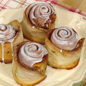 Carefully roll the dough, working away from you. Using a chef’s knife, cut the dough into even slices, about one to two inches thick. Arrange the slices in the cake pan to fill pan as much as possible, with the edges of the rolls in contact with each other. Bake for about 40 minutes, or until deep golden brown.