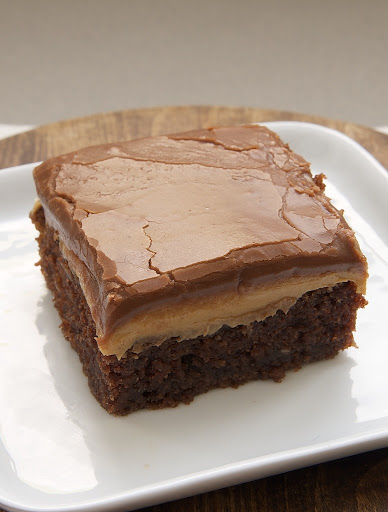 Cool in pan on wire rack for 10 minutes. Then, spread the peanut butter over the cake. Allow to cool completely.