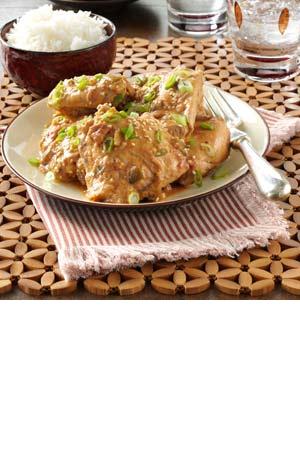 1 chicken thigh with 1/4 cup sauce (calculated without rice) equals 261 calories, 15 g fat (4 g saturated fat), 87 mg cholesterol, 350 mg sodium, 5 g carbohydrate, 1 g fiber, 27 g protein