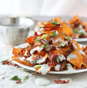 Baked Sweet Potato Chips with Blue Cheese Sauce, Bacon and Green Onion