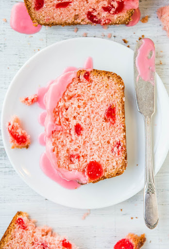 In a medium bowl, combine 1/4 cup reserved cherry juice, almond extract, about 1 cup confectioners' sugar, and whisk to combine until smooth and satiny. Add sugar until desired consistency is reached. Glaze the bread prior to serving. After the photos were done, I glazed much more liberally, spreading the glaze like butter on the interior of the slices. Bread will keep airtight at room temp for up to 5 days or in the freezer for up to 6 months. Do not glaze bread until ready to serve if you plan on storing long-term.
