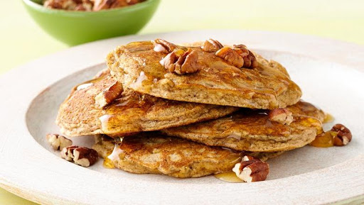 In medium bowl, beat flours, flaxseed, cinnamon, baking soda and salt with whisk. Add remaining Pancake ingredients; stir until smooth.
