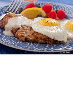 Meanwhile, in a medium skillet, cook eggs sunny-side up in batches. Serve on plate next to steak topped with gravy.