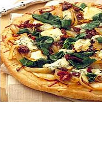 Spread caramelized onions on pizza crust and bake for 12 minutes. Remove from oven and add tomatoes, spinach and cheese. Bake until cheese is melted, about 3 more minutes. Season with freshly ground black pepper and serve.