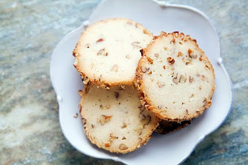 5 Preheat the oven to 350ºF with racks on the upper and lower thirds. Finely chop the remaining 1 1/2 cups of pecans. Unwrap one of the logs of dough and roll in the pecans. Cut into 1/4-inch-thick rounds. Space 1-inch apart on baking sheets lined with parchment paper or silicone mats.