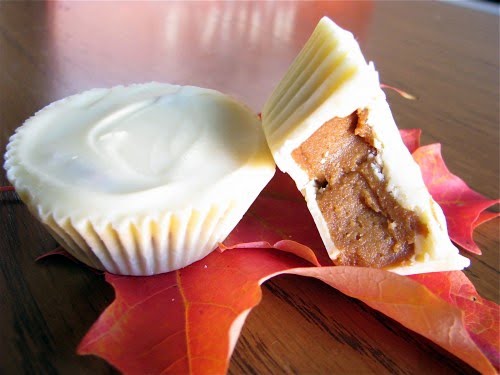 Using a mini ice cream scoop or a small spoon, evenly divide the pumpkin mixture between the hardened chocolate cups. Smooth the top to create an even surface.