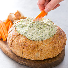 - Make the dip up to 24 hours ahead, but prepare and fill the bread bowl just before serving. Opt for a taller, domed loaf of sourdough over a flat, wide loaf. Serve with crudités, if desired.