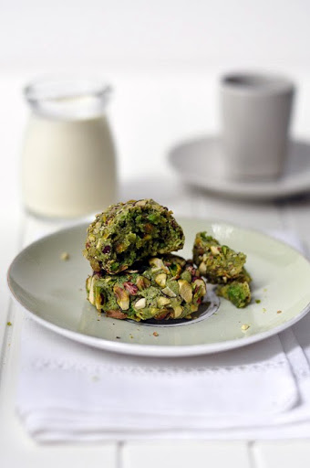 Scoop the cookie batter and form into little balls, (at this point, if you find the batter too sticky add a little bit more almond meal to the paste) then roll them in the remaining 100 grams of pistachios.