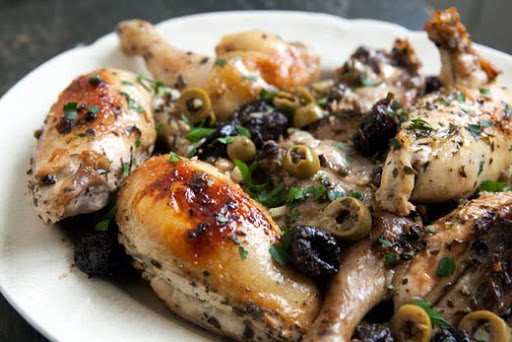 n a large bowl combine garlic, oregano, salt and pepper to taste, vinegar, olive oil, prunes, olives, capers with caper juice, and bay leaves. Add the chicken pieces and coat completely with the marinade. Cover and let marinate, refrigerated, several hours or overnight.