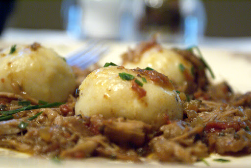Veal ragù is very commonly served with Pappardelle pasta, but it goes extremely well with gnudi too