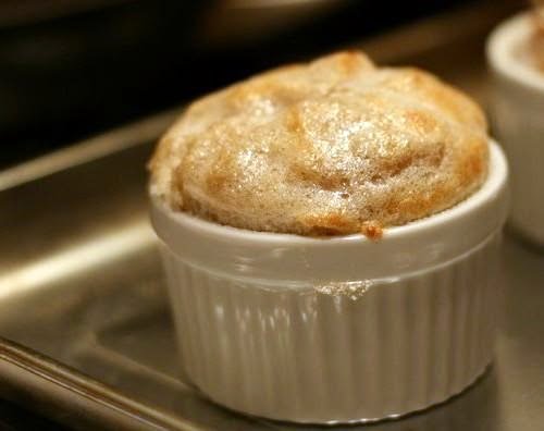 7. Fold cooled banana puree into egg white mixture. Pour into ramekins and place ramekins on a baking sheet.
