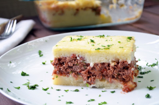 Place half of mashed potatoes on the bottom of a medium ovenproof deep-dish. Cover with ground beef sauce and top with remaining mashed potatoes. Sprinkle Parmesan cheese on top and bake until top is golden brown and pie is heated through; 10 to 15 minutes. Remove from oven and let cool 15 minutes. Serve with jasmine rice on the side (optional).