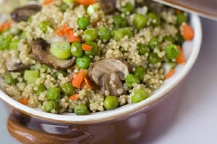 Place quinoa in fine-mesh strainer and rinse under cold water until water runs clear. Drain quinoa and set aside.