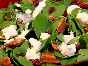 Wash & dry spinach and lettuce. Take stems off spinach, cut up lettuce. Place in large enough bowl to toss in. (This is a BIG salad!) Add swiss cheese, cottage cheese, bacon, mushrooms & red onion. Toss with dressing. Serve immediately! (Don’t toss with cottage cheese and dressing until just before serving or it will get soggy.)