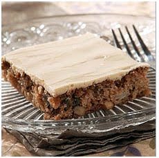 This cake is an old, old favorite of ours. It’s a cake where the whole is definitely more than the sum of the parts. The moist, semi-chunky cake, spread with the frosting equivalent of brown sugar fudge, is perfect served with a cup of coffee or, better still, a glass of ice-cold milk