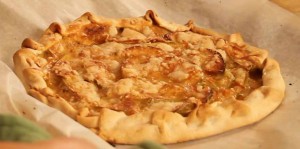 Unroll pie crust, and begin to place apple slices in a circle about 1 ½ inches from the edge of the crust. Place about 2 layers of apple slices on the crust. Roll the edges of the crust to contain the apple slices and pinch the crust together. Melt the marmalade and brandy together, and