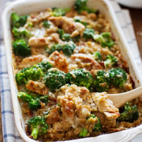 Bake: Remove the casserole from the oven, check the mixture by stirring it around in the pan, and if needed, cover and bake for an additional 10-15 minutes. When the quinoa and chicken are cooked, add the broccoli and a little bit of water (up to one cup) until the consistency is creamy and smooth and you can stir it up easily in the pan. Top with the cheese and bake, uncovered, for 5 minutes, or just long enough to melt the cheese.