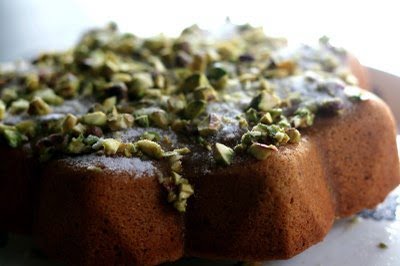 Once cooled a little, turn onto a wire rack and allow to cool totally. To serve, mix the lemon juice, chopped pistachios and half the extra sugar in a small bowl. Drizzle and spread over the top of the cake, dust with extra sugar.