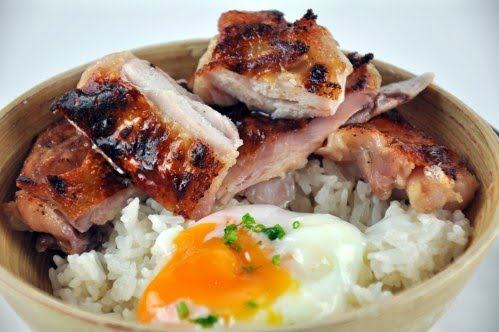 Portion the rice in four bowls and use the back of the spoon to create a shallow space in the middle and slide the slow poached egg into it. Divide the cucumber pickles among the bowl (recipe follows but I didn’t bother with this), nestling them together in a little mound. Add the chicken around the bowl and sprinkle with the scallions (or in my case, chives) and serve.