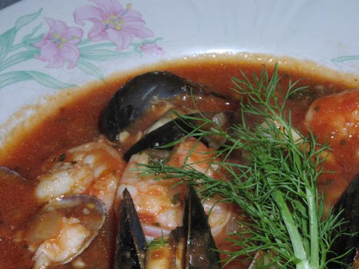 7. Transfer cioppino to a tureen or ladle into wide bowls. Garnish with green fennel tops.