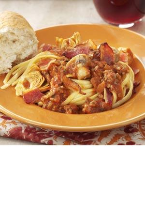 In a Dutch oven, cook the beef, mushrooms and onion over medium heat until meat is no longer pink; drain. Stir in spaghetti sauce and artichoke hearts. Heat through. Sprinkle with bacon and serve with linguine.