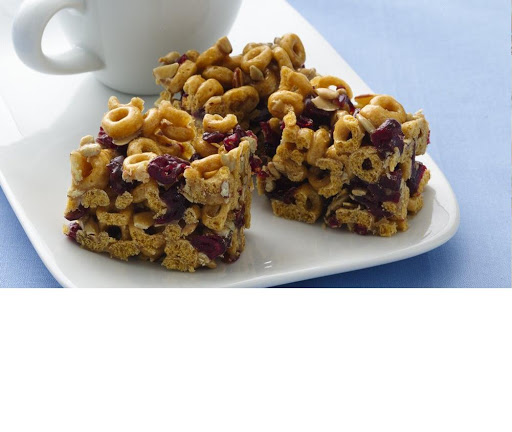 1 Spray 9-inch square pan with cooking spray. In large bowl, mix cereal, cranberries, almonds and sunflower nuts.