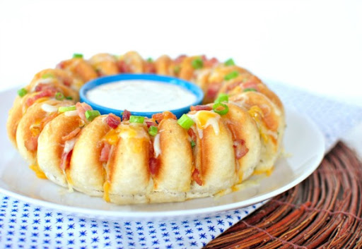 7. Reduce the oven temperature to 350 degrees and slide the stuffed ring onto a lined, rimmed baking sheet and place it back into the oven to continue to bake for and additional 10 minutes.