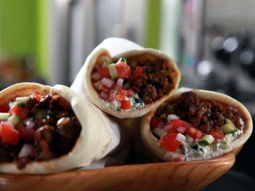 For the sandwich build: Schmear the tzatziki on the pitas, then place on the lamb and top with cucumber tomato relish.