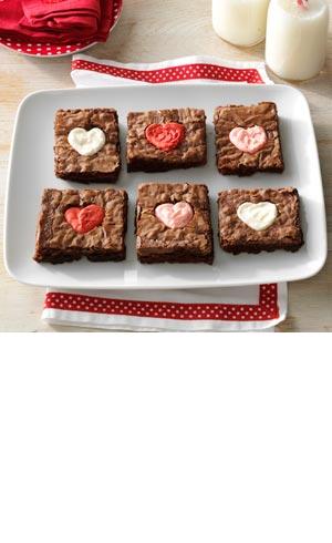Line a baking sheet with parchment paper. Dust with cocoa; set aside. Cut brownies into 15 rectangles. Using a 1-1/2-in. heart-shaped cookie cutter, cut out a heart from the center of each brownie. Reserve cutout centers for another use. Place brownies on prepared baking sheet. Pipe frosting into centers of brownies.