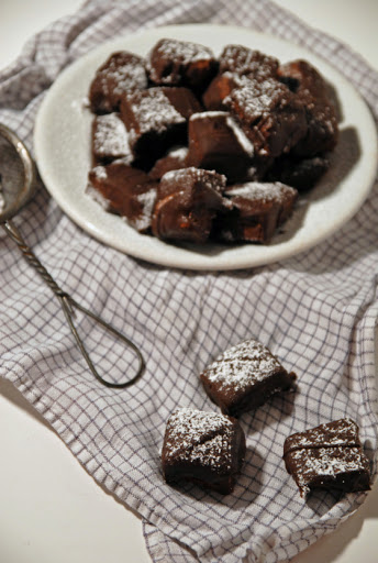 6.After ganache has been frozen, remove from pan and let thaw at room temperature for a few minutes until softened. Cut ganache into square pieces. Transfer pieces to a cookie sheet or cooling rack placed over a baking sheet. Pour melted semisweet chocolate over all pieces, coating each piece in chocolate. Allow to harden at room temperature, then transfer to refrigerator or freezer to store.