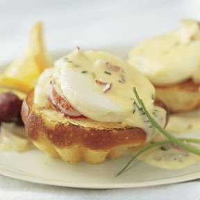 Add the reserved lobster meat to the sauce and heat until warmed through, about 3 minutes. Place 2 brioche or muffin halves on each of 4 warmed plates. Using a slotted spoon, transfer the lobster meat to the brioche or muffin halves, dividing evenly. Top each with an egg and some of the sauce. Sprinkle with the chives. Serve immediately.